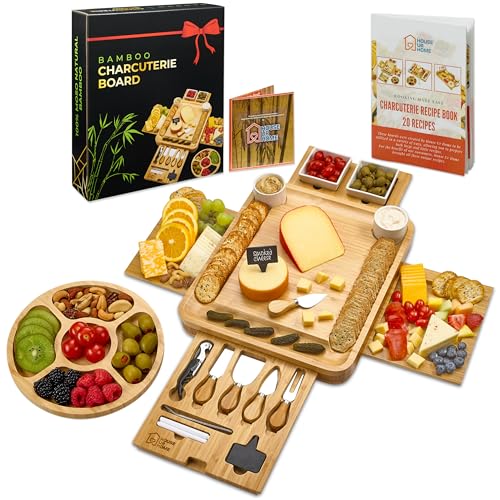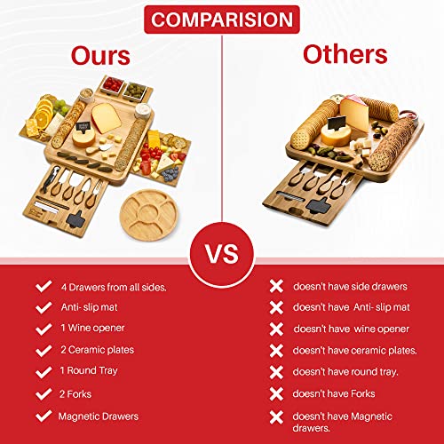🎁 SEE &FEEL LUXURY OF A PREMIUM CHARCUTERIE BOARD & CUTLERY SET! Made from Eco- Friendly, Sustainably grown and 100% natural bamboo, Our cheese board will add a touch of elegance to your every party or family gathering the slide out Tray has 4 knives, that are made of high quality stainless steel with bamboo handles that are easy to grip. In addition the wooden board sets comes with 2 CERAMIC BOWLS 2 PLATES & 3 Slat Labels 2 Markers & WINE OPENER & 2 Server Forks Will make your cheese- Tasting!